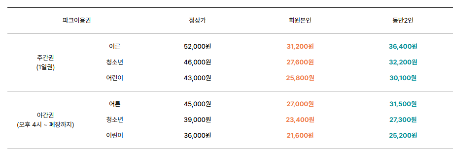 | 종일권(1일권) | 52,000 | 46,000 | 43,000 |
