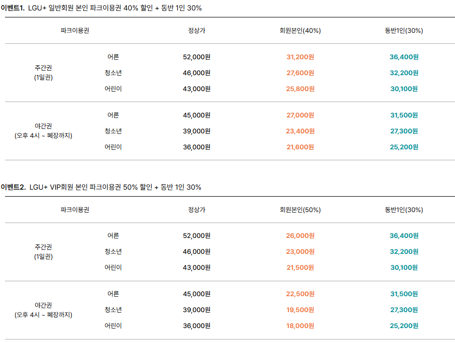 LGU+멤버십 VIP 회원 50%, 일반회원 40% 할인 + 동반 1인 30% 할인